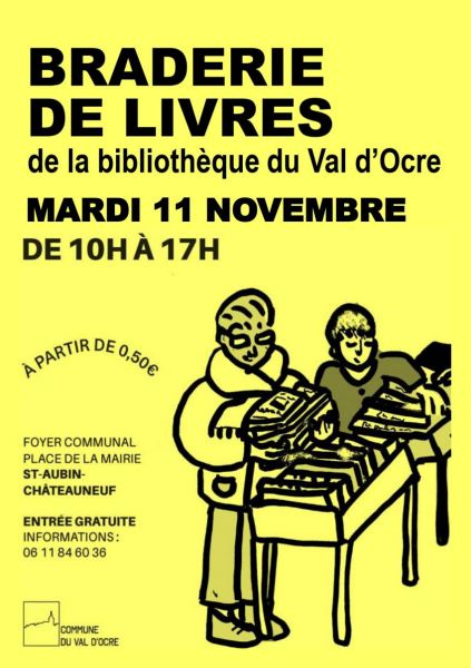 le mardi 11 novembre de 10h à 17h au foyer communal de Saint-Aubin. Livres d'occasion à tout petit prix.