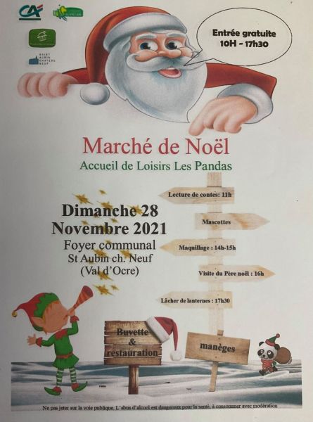 Le marché de Noël, organisé par le centre de loisirs des Pandas, aura lieu le dimanche 30 novembre de 10h à 18 h au foyer communal de Saint-Aubin.
